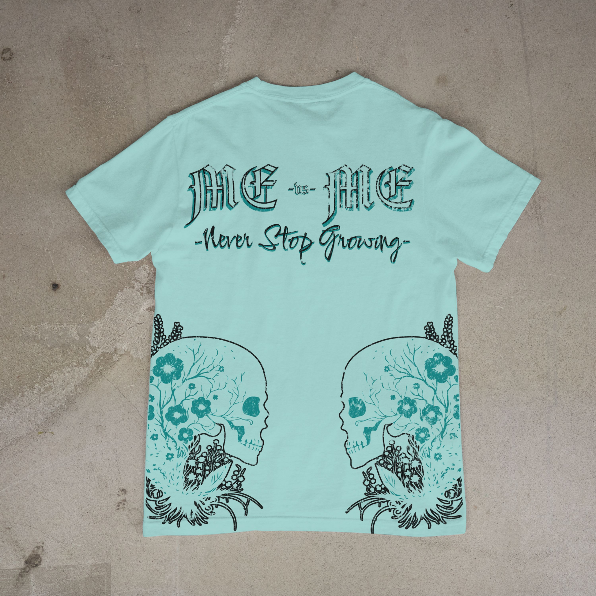Unique Design: Back print showcases “ME vs ME” lettering with the reminder Never Stop Growing, paired with detailed skull and floral illustrations.