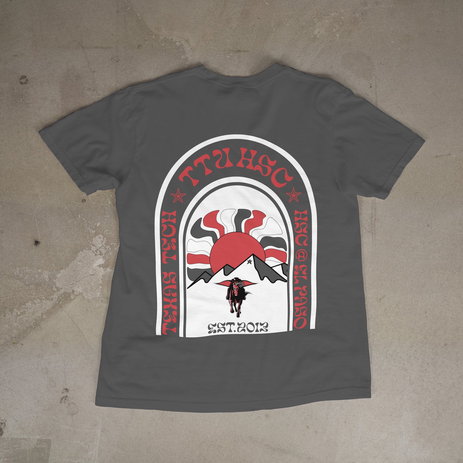 Retro Collegiate Design: Custom TTUHSC artwork with a sunburst and mountain backdrop for a timeless look.